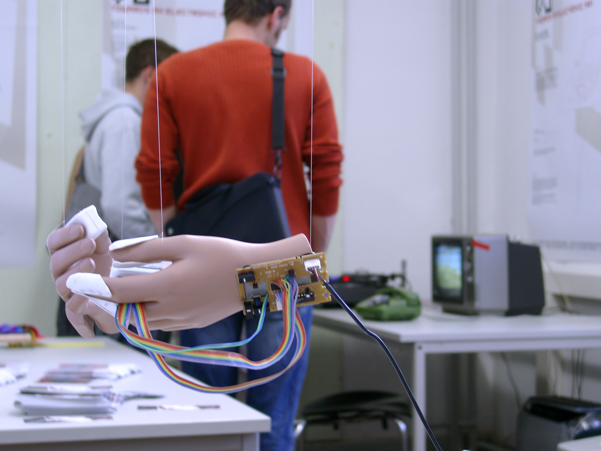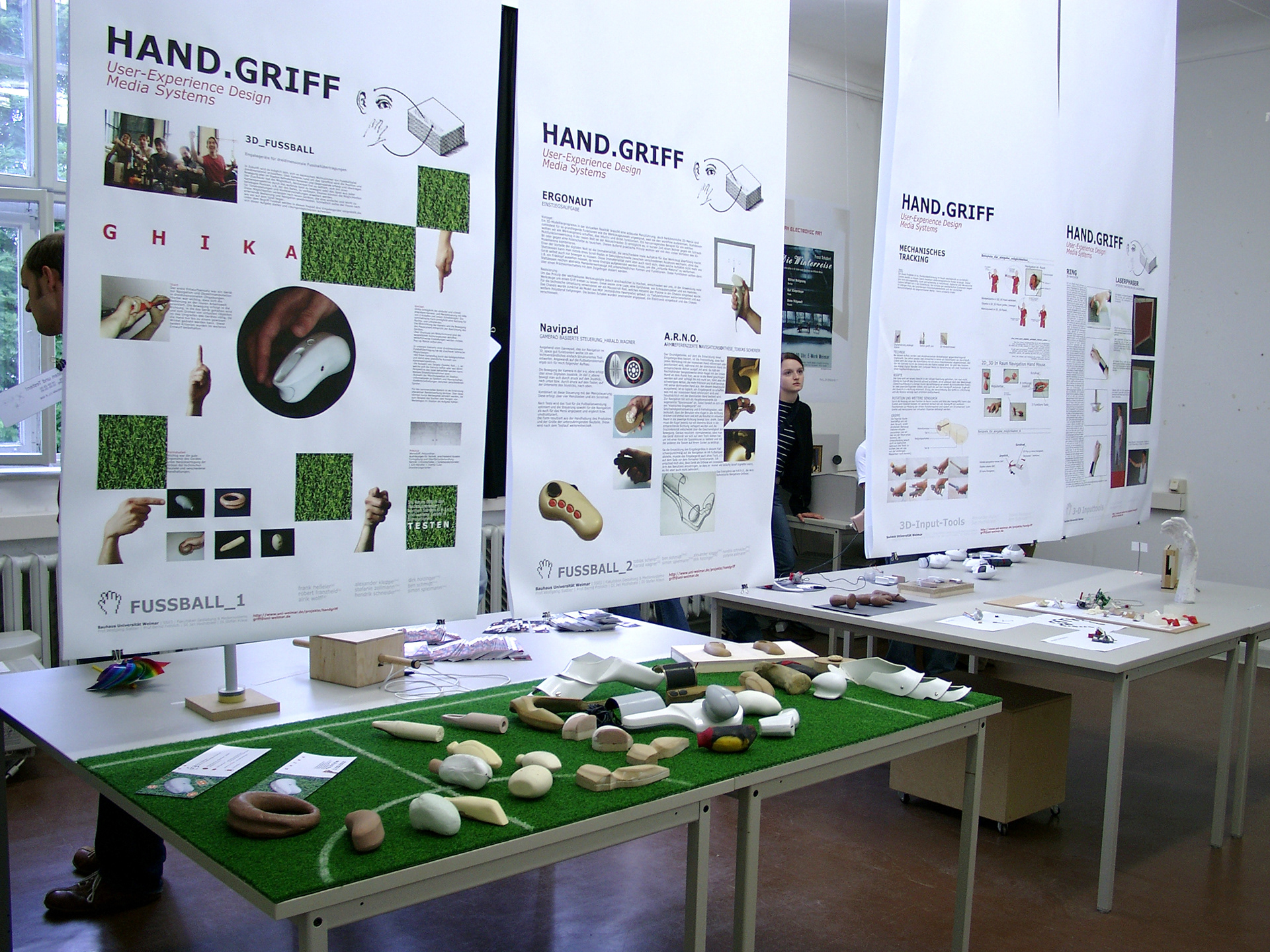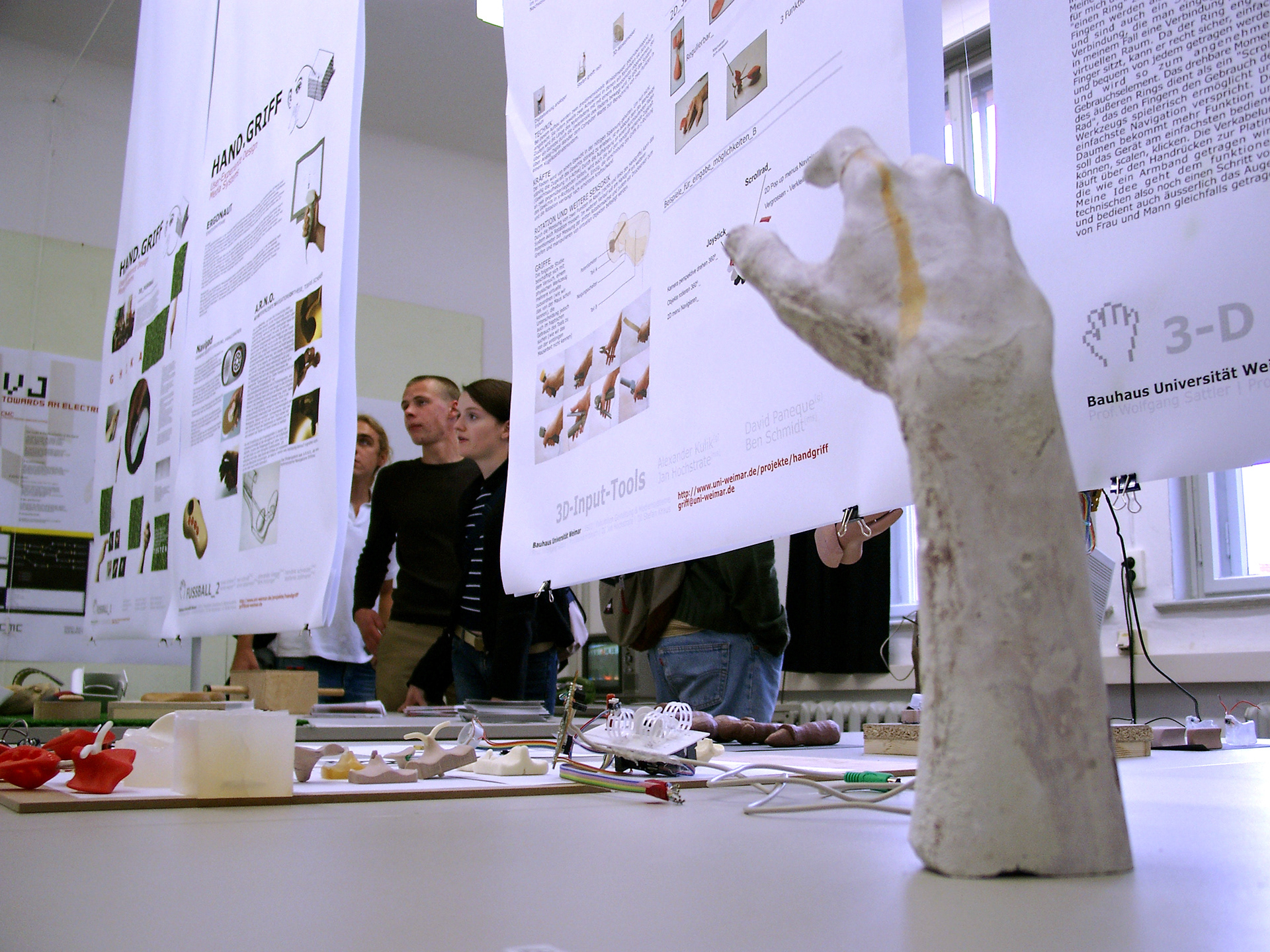 User-Experience Design meets Media Systems Engineering. Ergonomische Grundlagen der Hand. Greifen und Begreifen im Informationszeitalter. Handgriffe zum "Begreifen" der Informationswelten und Informationsräume. Technologische Entwicklungen ändern sich mit atemberaubender Geschwindigkeit. • welche gesellschaftliche Bedeutung hat es, wenn für alle Menschen auf diesem Planeten jeweils hunderte von Mikrochips zur Verfügung stehen? Welche kulturellen Konsequenzen folgen daraus, wenn alle uns umgebenden Objekte "intelligent" und "connected" sind? Was passiert in psychologischer Hinsicht, wenn man einen Gegenstand benutzt und dieser Gegenstand "erkennt" seinen Nutzer? Wwelche Auswirkungen hat die Miniatisierung der Geräte für die erreichten Grenzen der natürlichen Sinne der Benutzer? Was heisst "greifen" und "begreifen" in Zeiten des pervasive computing? Die Interaktion an sich wird Gegenstand des gestalterischen Prozesses. Bei diesem Projekt geht es um die Gestaltung von Eingabegeräten für die Interaktion mit und innerhalb digitaler Welten. In Kooperation mit dem Studiengang Mediensysteme werden die gestalterischen und medientechnischen Grundlagen bearbeitet. Betreuer: Prof. Wolfgang Sattler, Prof. Bernd Fröhlich, DI Stefan Kraus, DI Jan Hochstrate ___________________________________ Ergonomic fundamentals of the hand. Grasping and understanding in the information age. Handles to "understand" the information spaces. Technological developments are changing at breathtaking speed: What social significance does it have if hundreds of microchips are available to all people on this planet? What cultural consequences follow from this, if all surrounding objects are "intelligent" and "connected"? What happens psychologically when you use an item and this item "recognizes" its user? What effects does the miniaturization of the devices have on the limits reached by the natural senses of the users? What does "grabbing" and "understanding" mean in times of pervasive computing? The interaction itself becomes the subject of the creative process. This project is about designing input devices for interacting with and within digital worlds. In cooperation with the degree program Media Systems the design and media technology basics are worked on. Supervisors: Prof. Wolfgang Sattler, Prof. Bernd Fröhlich, DI Stefan Kraus, DI Jan Hochstrate