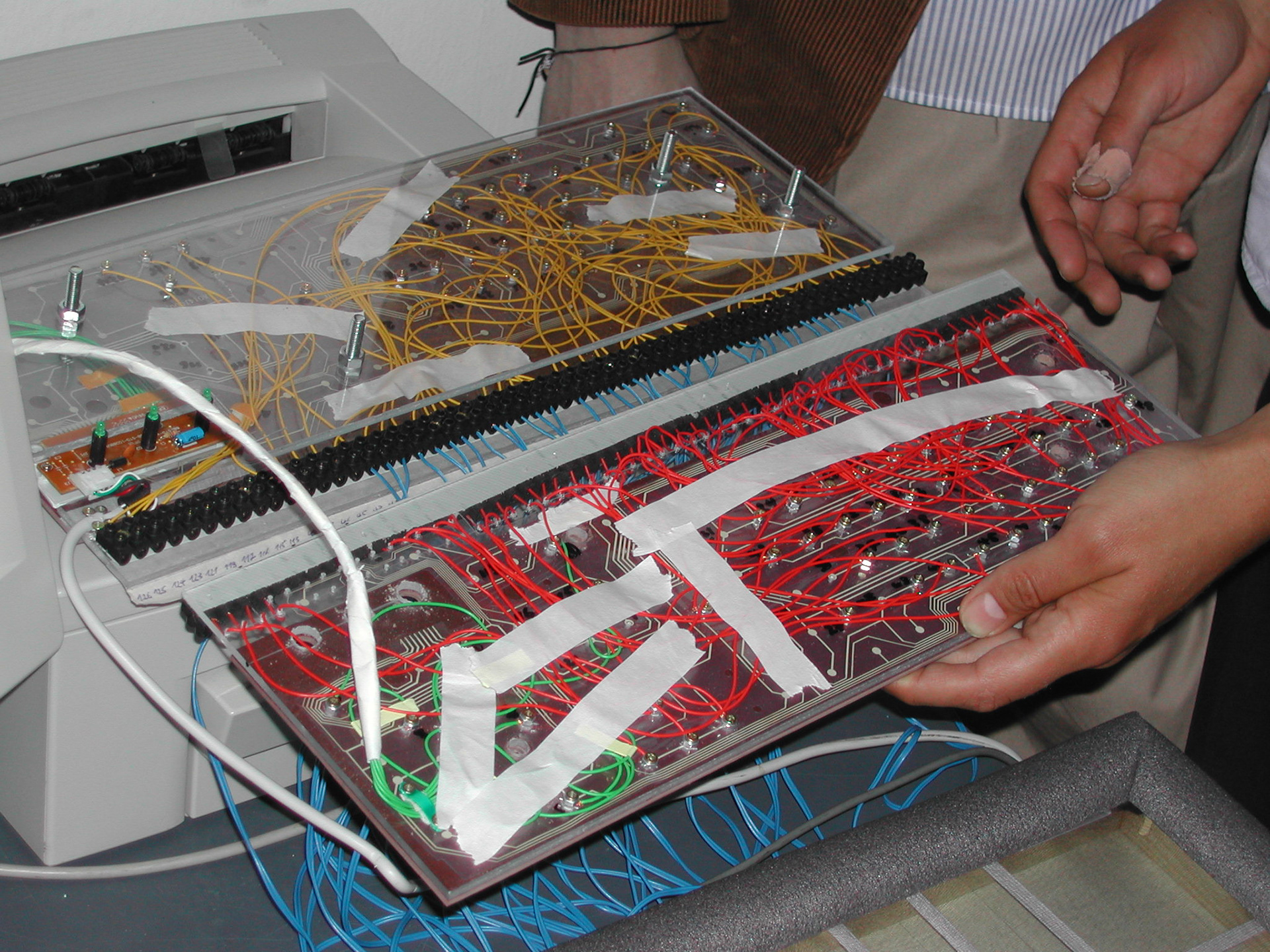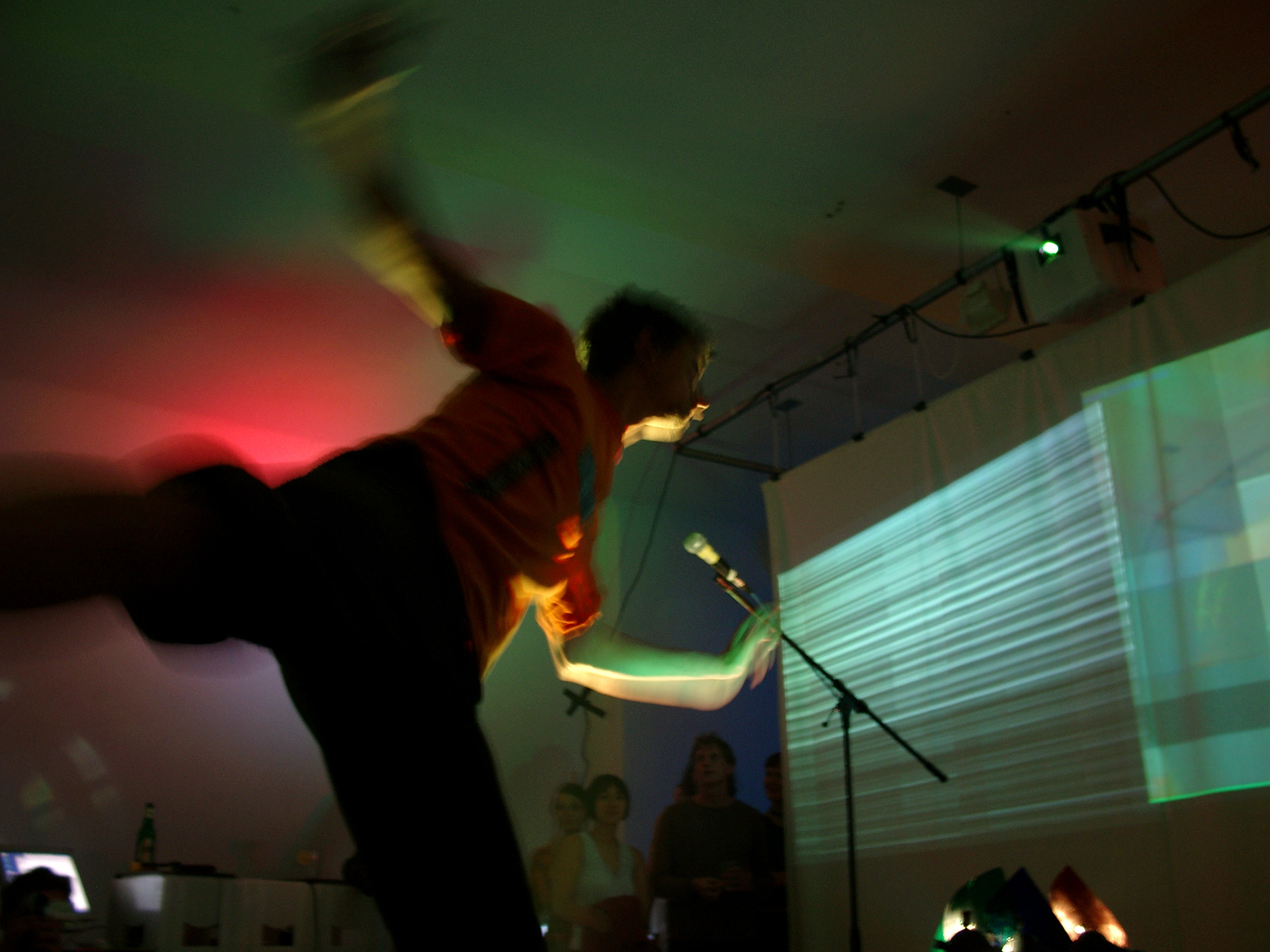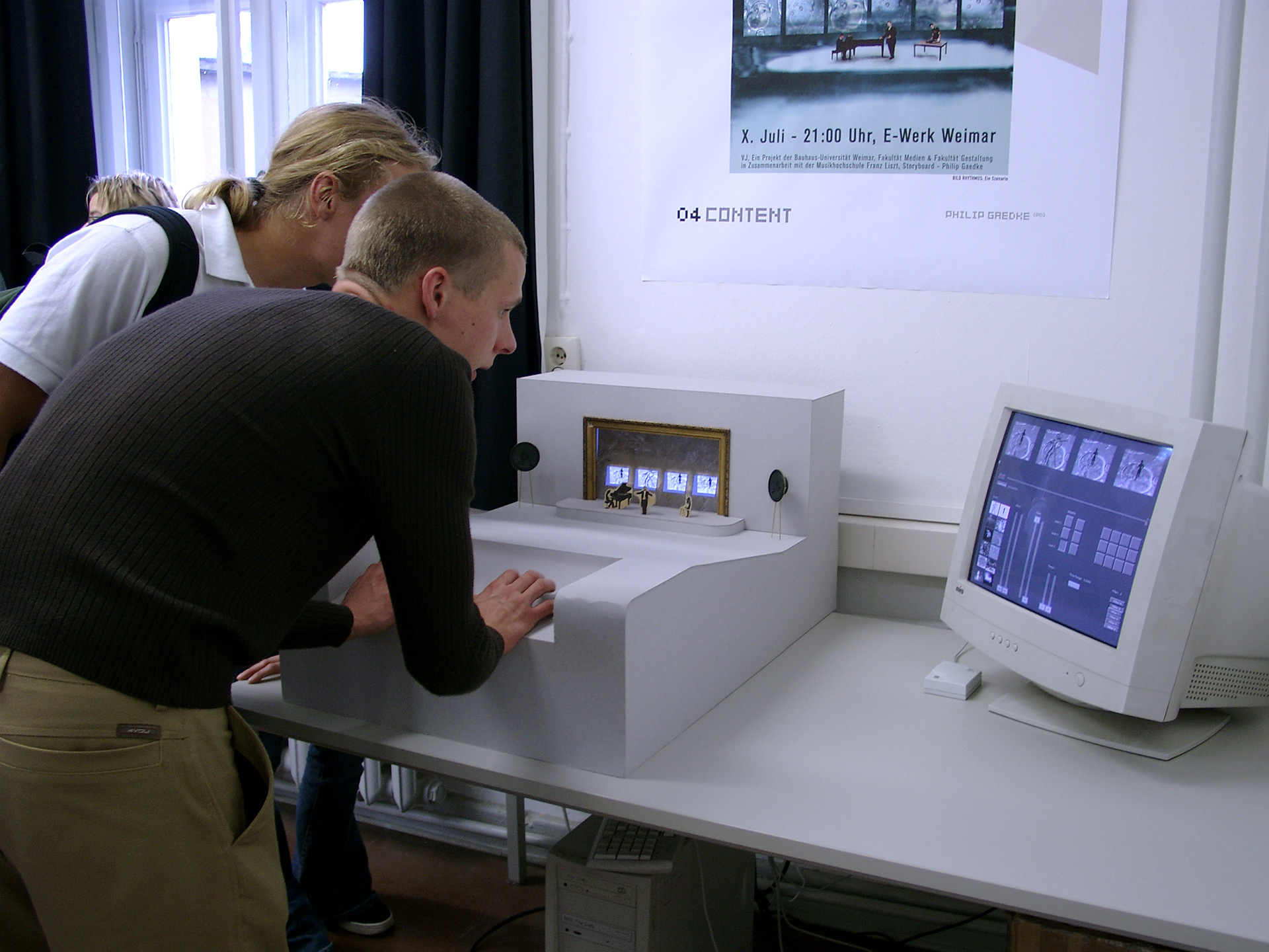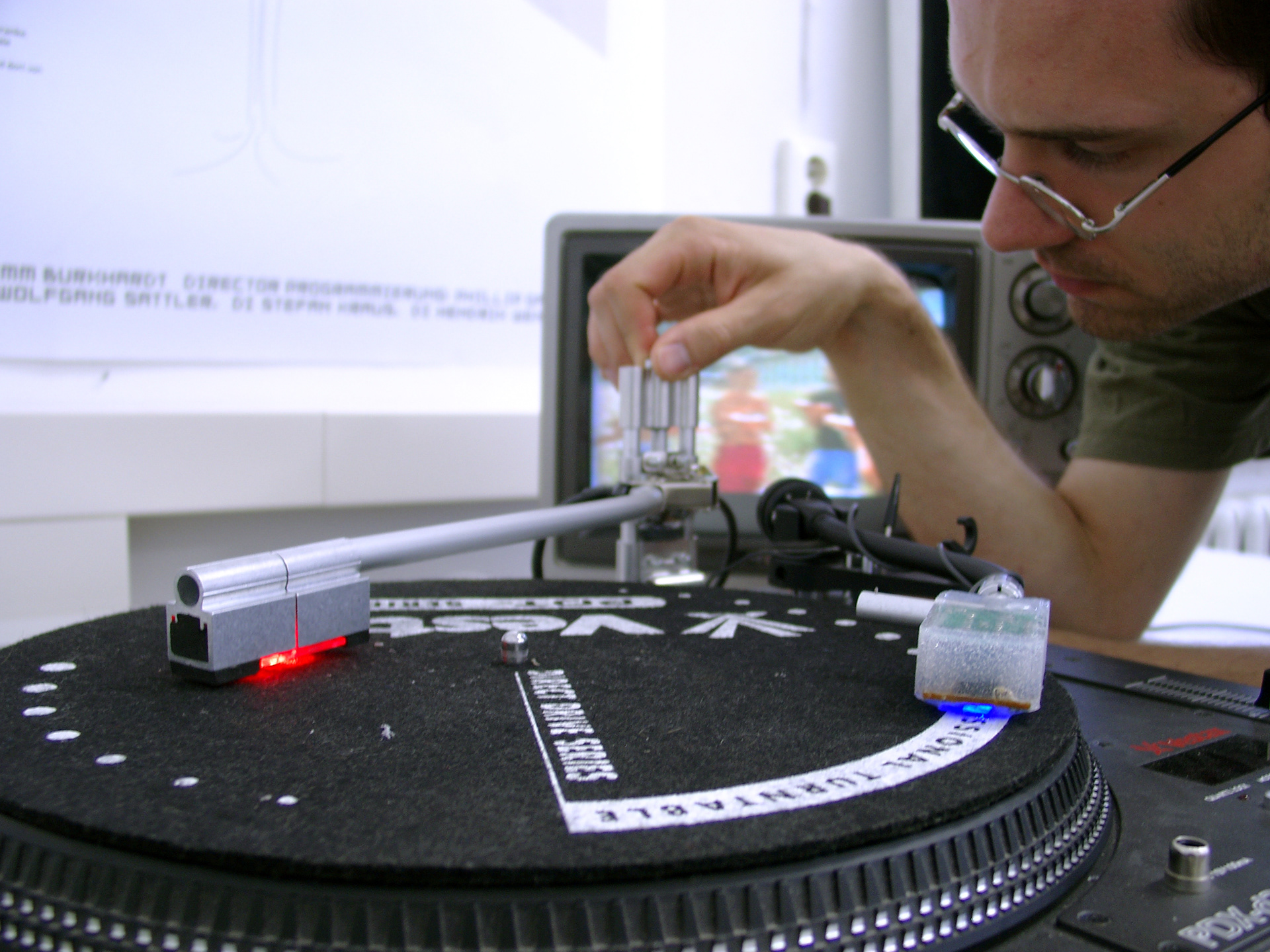 V(ideo)J(ockey)-ing als elektronische Performance hat viele Vorläufer und ein weitgefächertes Zukunftspotential. Als eigenständige Aktionsform, als nichtlineare Erzählform, als smart surface, als visueller Jazz, als aktives Environnement und als Bühnenbild. Als Kunstform grenzt sich VJing gegenüber der traditionellen Film- oder Diaprojektion durch seine Entstehung in Echtzeit ab, und ähnelt damit eher dem Spielen eines Instrumentes als der Arbeit am Schnitttisch. Dieser Analogie wollen wir nachgehen und in diesem Projekt gestalterische Lösungen entwickeln, mit denen VJs Zugriff auf die Funktionen modernster Grafikhardware bekommen, um einem Dirigenten nicht unähnlich Effekte, Footageloops und Parameter in Echtzeit zu einer audiovisuellen Performance zusammenbrauen zu können. Zu diesem System sollen innovative Schnittstellen für elektronische Kunstformen, jenseits des Powerbook Touchpads entwickelt werden. Ziel ist die Herstellung funktionsfähiger Prototypen. Betreuer: Prof. Wolfgang Sattler, Prof. Bernd Fröhlich, DI Stefan Kraus, DI Hendrik Wendler _____________________________________ V (ideo) J (ockey) -ing as electronic performance has many forerunners and a broad future potential. As an independent artform, as non-linear narrative form, as smart surface, as visual jazz, as an active environment or as stage design. As an artform VJing distinguishes itself from the traditional film or slide projection by its creation in real time and is thus more akin to playing an instrument than working on a cutting table. In this project we want to pursue this analogy and develop creative solutions that give VJs access to the features of cutting-edge graphics hardware, so that they - similar to a conductor - can perform an audiovisual performance by controlling effects, footage loops and parameters in real-time. To this system innovative interfaces for electronic art forms, beyond the Powerbook Touchpads are to be developed. The goal is the production of functional prototypes. Supervisors: Prof. Wolfgang Sattler, Prof. Bernd Fröhlich, DI Stefan Kraus, DI Hendrik Wendler