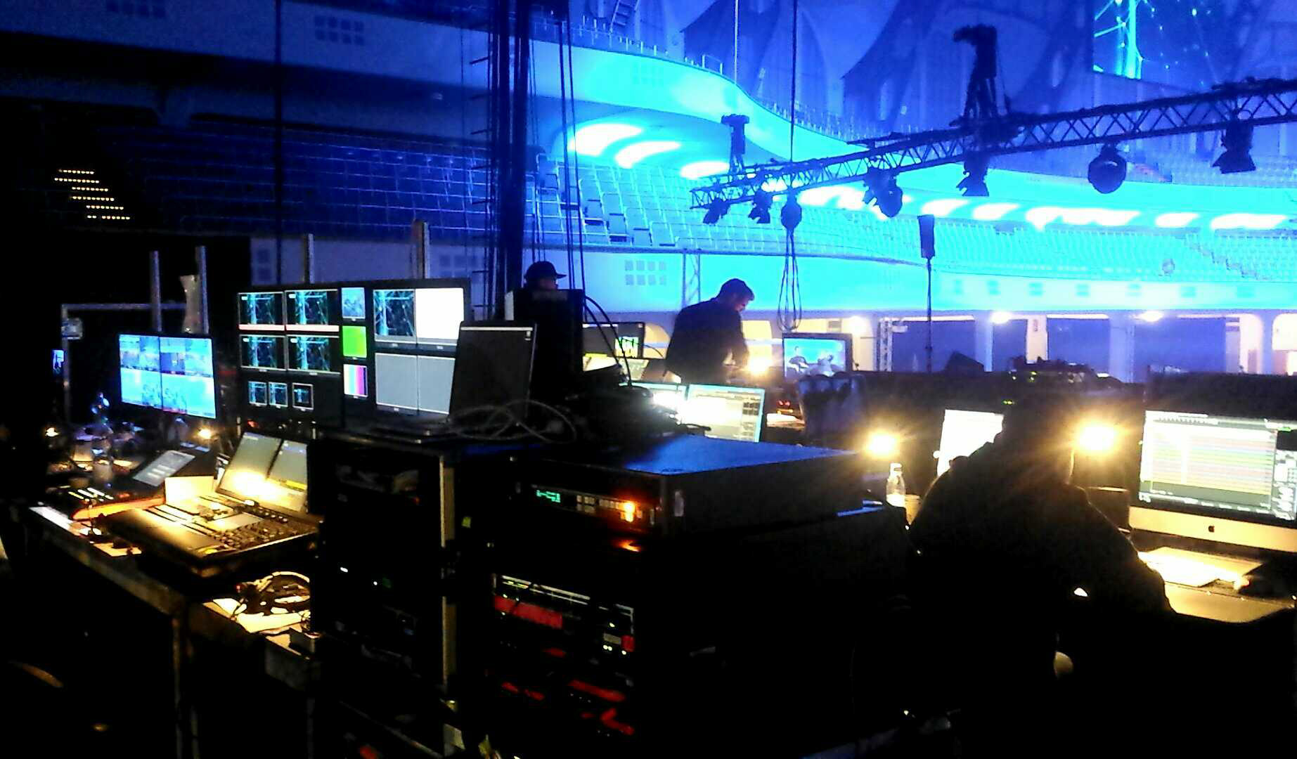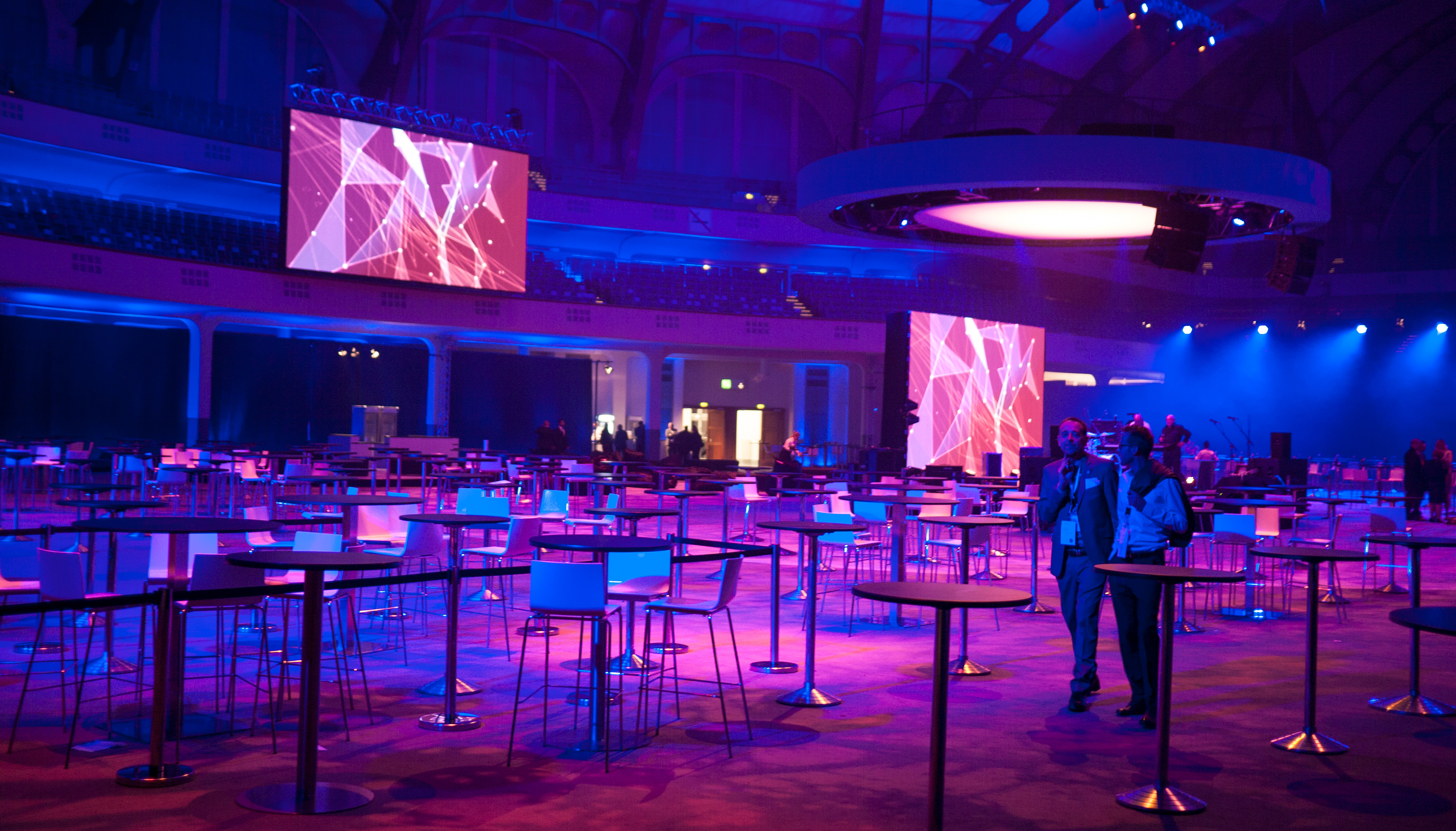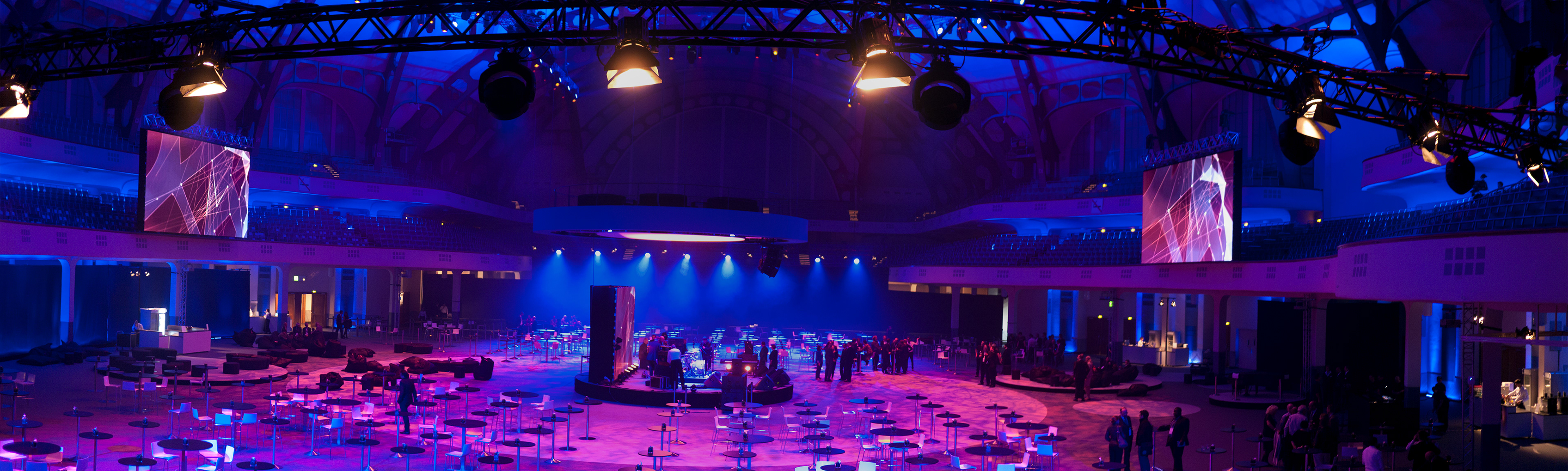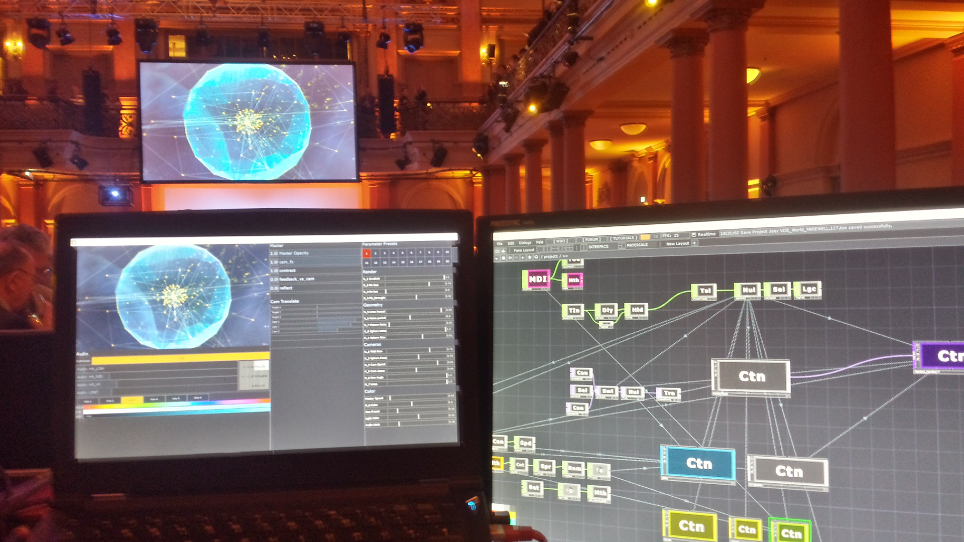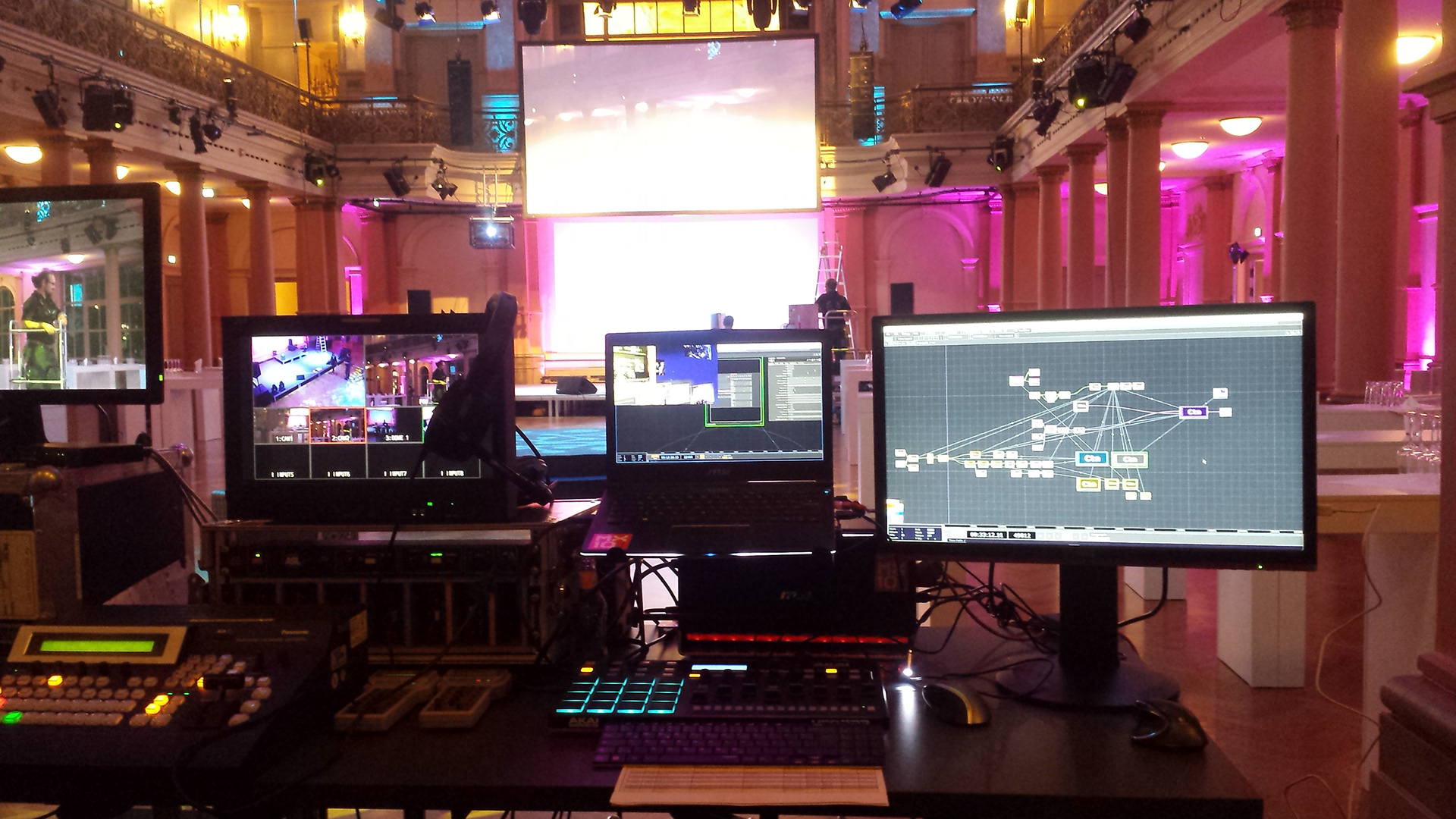3c, a leading agency for corporate communication commissioned me to create generative visual content for several event during the annual meeting of the World Association of Electrotechnical Standardization. I programmed an audio-reactive virtual world in the visual programming environment TouhDesigner, that could be controlled live with a custom interface. The same system was used at the farewell event to show photos of the meeting as tiles, floating dynamically in space.
