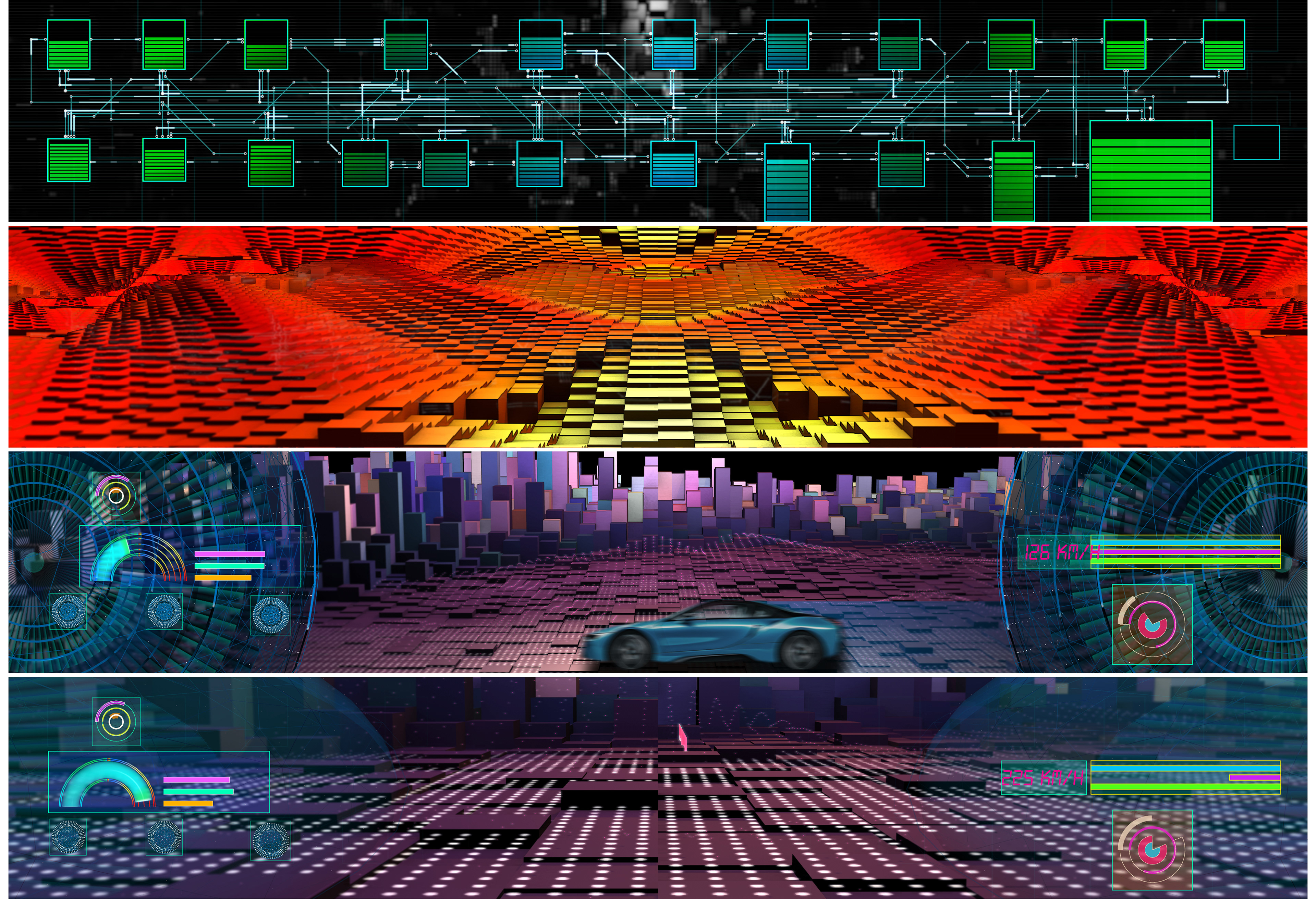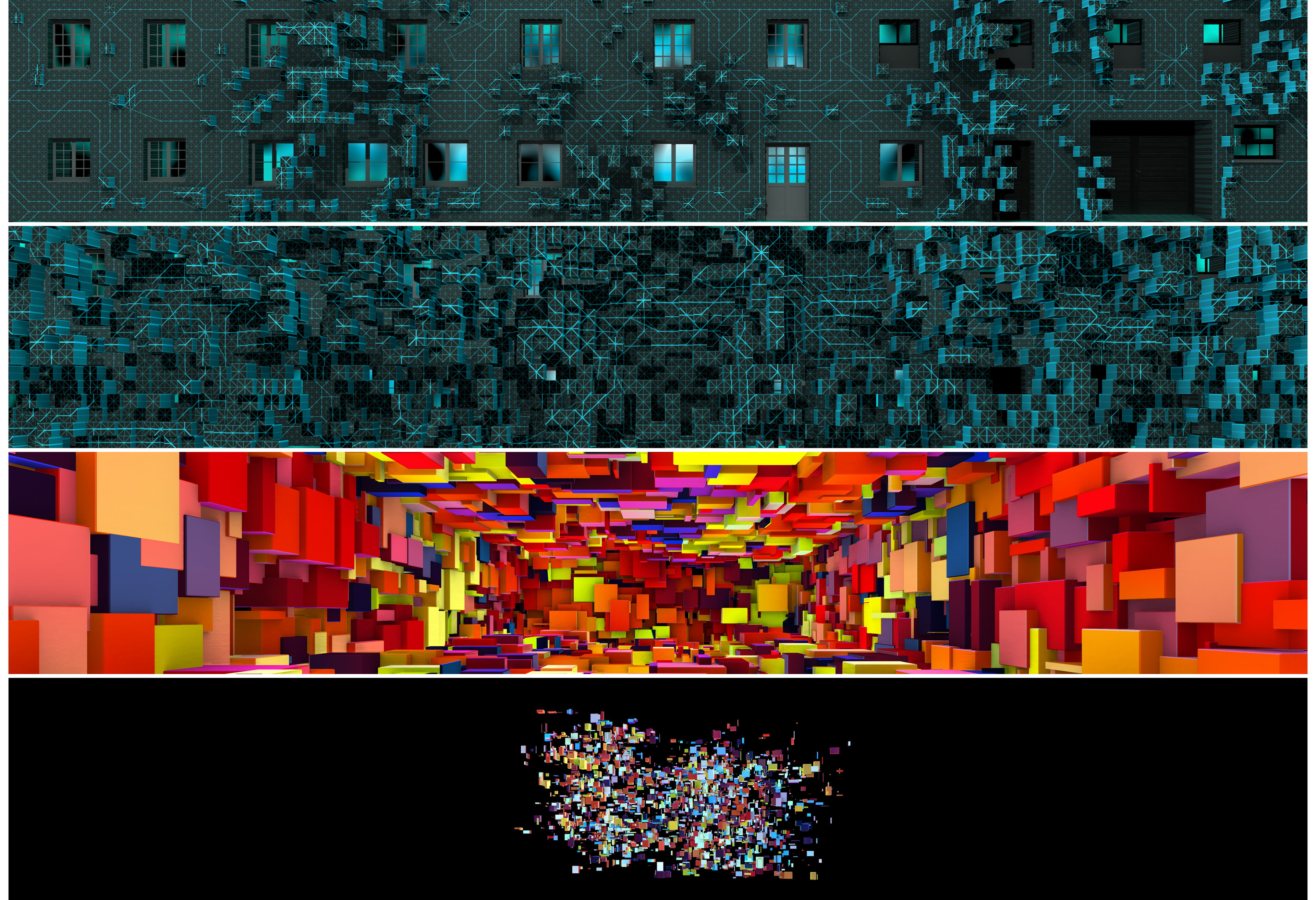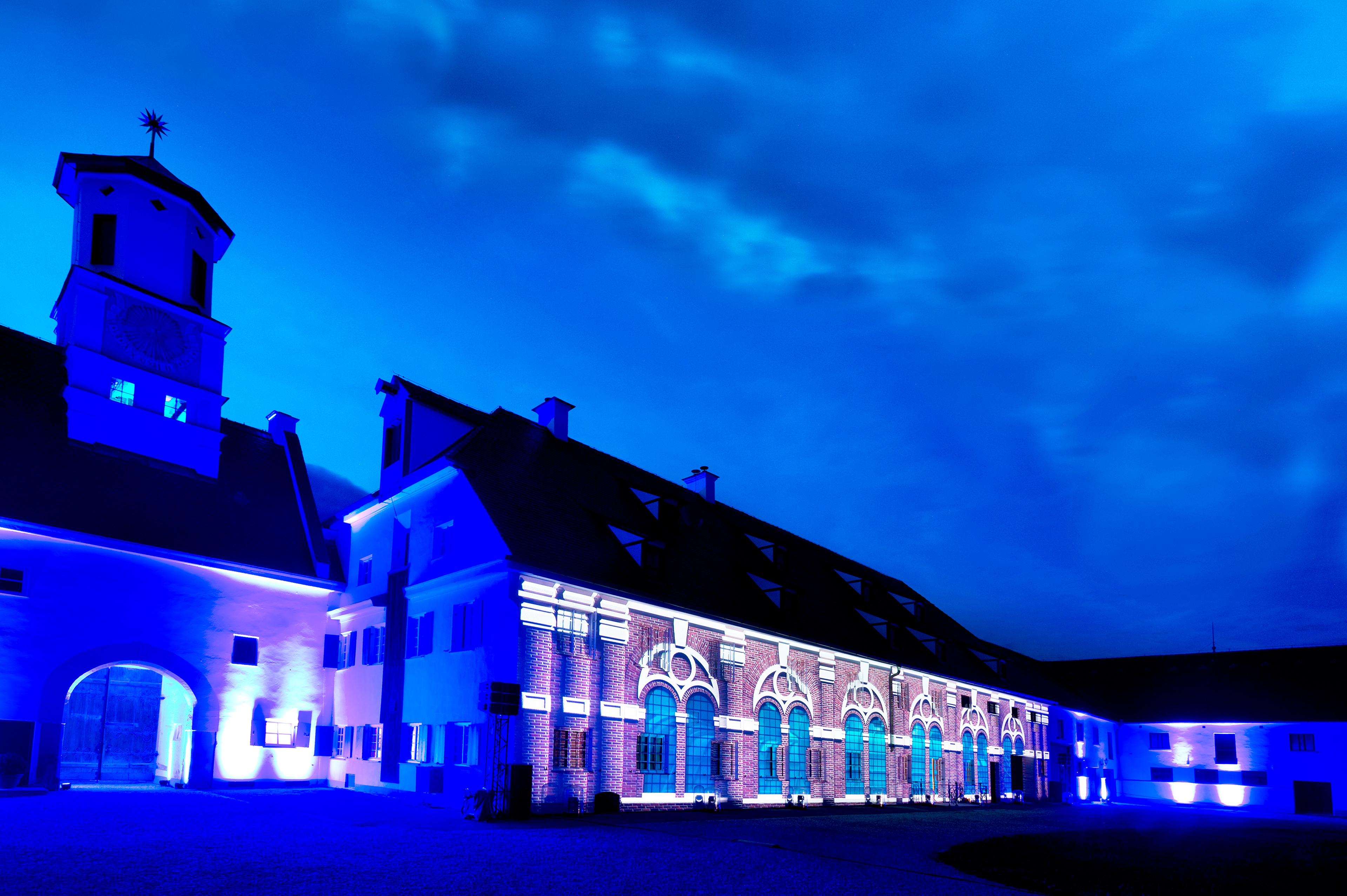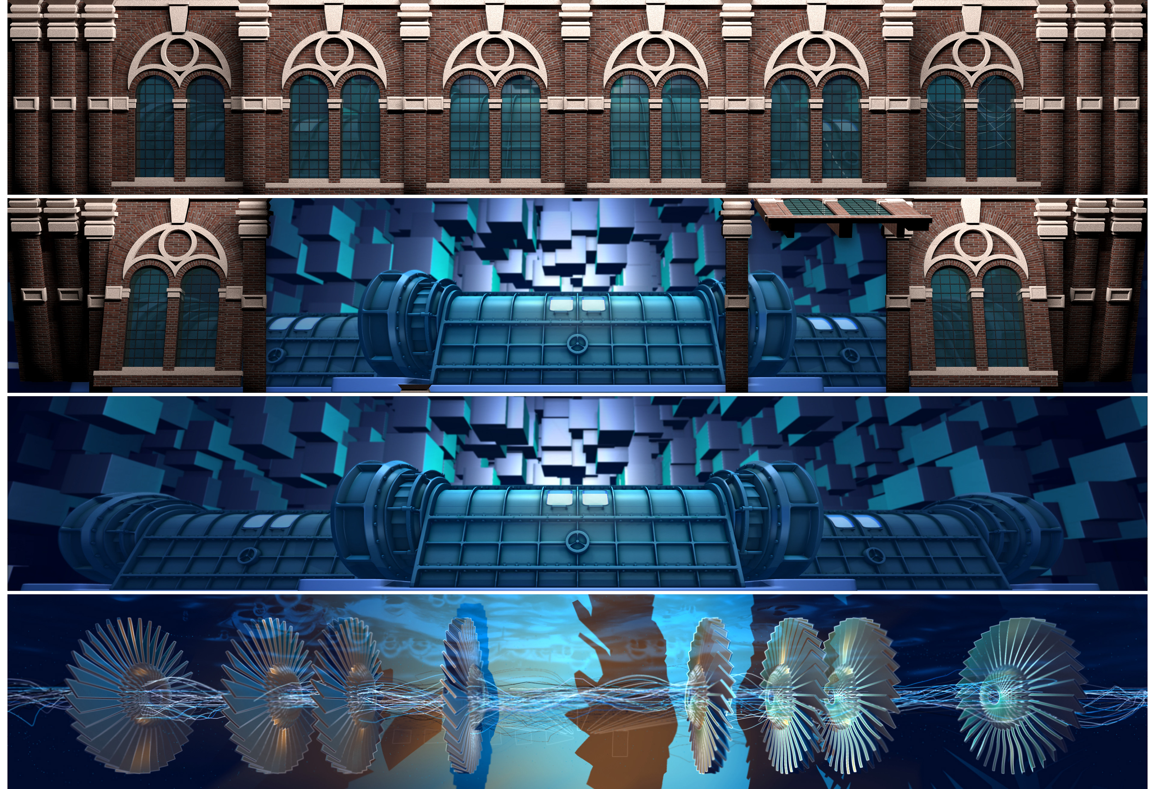 In summer 2017 I was asked by the event company brandentertainment.de to produce a projection mapping show for one of the leading energy providers in southern Germany, the Lechwerke AG, short LEW. The objective was to create an audiovisual experience for their approx. 2000 employees on an idyllic castle near Augsbug. It was much fun to dig into the history of a company that has been on the forefront of electric energy in Germany since the very beginning. Budget was limited though, so I decided to render and produce the movie completely in TouchDesigner, a visual programming environment mostly used for interactive live productions. This challenged me to develop a custom workflow and a suitable esthetic but also brought the benefit of realtime render into a 4k production which I realised on nothing but two MSI GS30 laptop computers. Finally I designed a playback and mapping solution in TouchDesigner. Editing and compositing was done with Adobe CreativeCloud. Additional 3D modelling and rendering was provided by iris-crisis in 3D Studio Max.