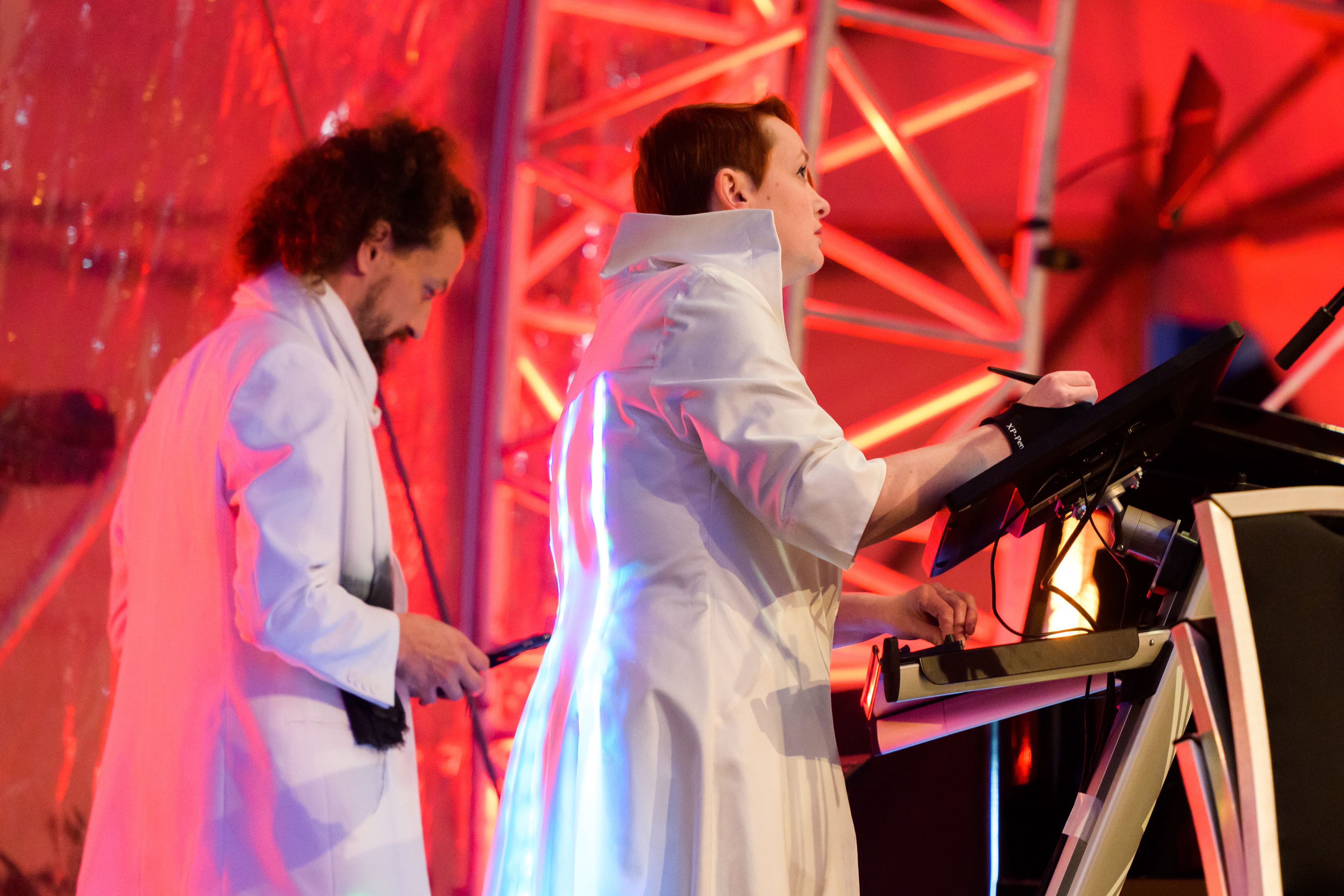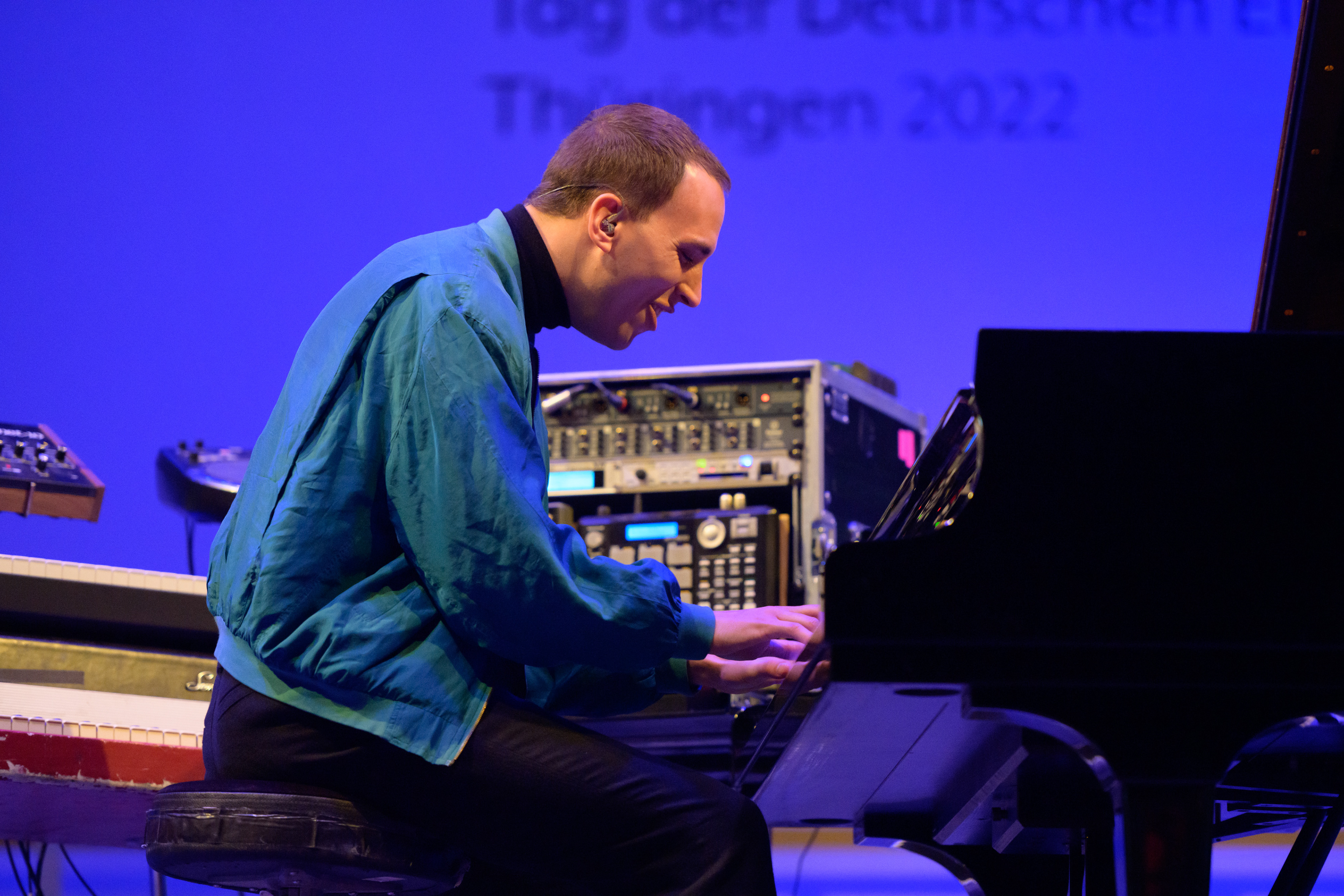 Improvisation not only played an important role for the visual artists, some of whom used live painting and specially programmed software to create moving images that only come into being at the moment they are viewed, but is also part of the core of most musicians’ performance practices. The Jena Philharmonic Orchestra opened the program on Saturday evening with an ensemble of over 60 musicians, while composer and pianist Martin Kohlstedt took the audience on a journey into his personal musical world and by storm. On Sunday, the Klezmer Orchestra Erfurt brought Yiddish festive music to the stage with more than 70 performers, followed by NoAccidentInParadise, an electronic trio that used site-specific samples to create a unique and captivating concert. Together, the artists presented a site-specific and cross-genre art experience that intertwined sound, image, and space, playfully transcending the divisive.