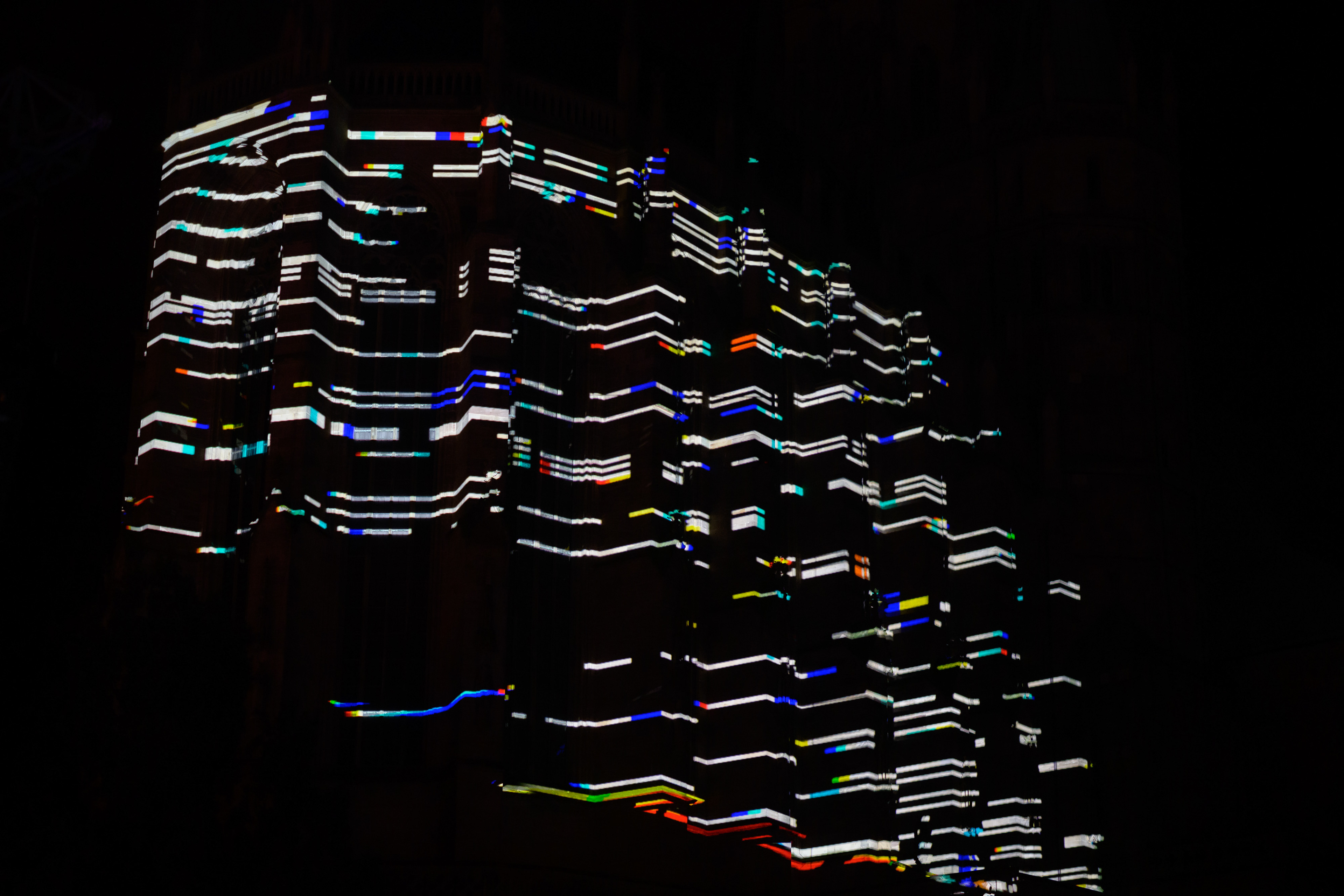 I did not only curate the participating artists and comissioned the 3D scan, but also wrote custom software in TouchDesigner to facilitate the precise mapping of the three projectors. As the visuals were performed live, one of the challenges was to send the 4k video signal across the square and map it onto the 3D model. The same software was used for previsualisation. With the help of Markus Heckmann, we were able to optimize the onboard mapping tools to work with a very high polygon count. The technical production was spearheaded by Dresden based Neumann+Müller.