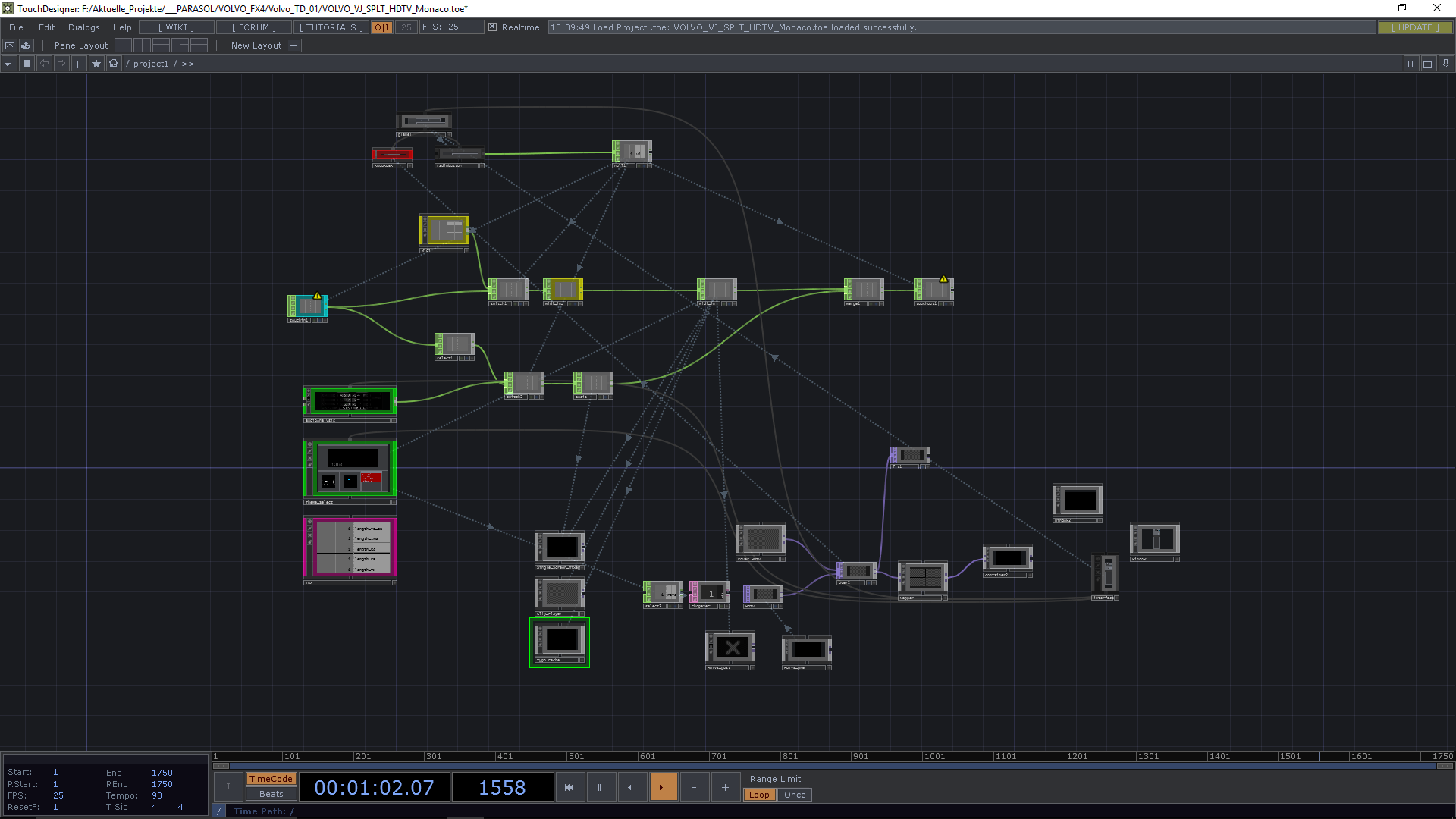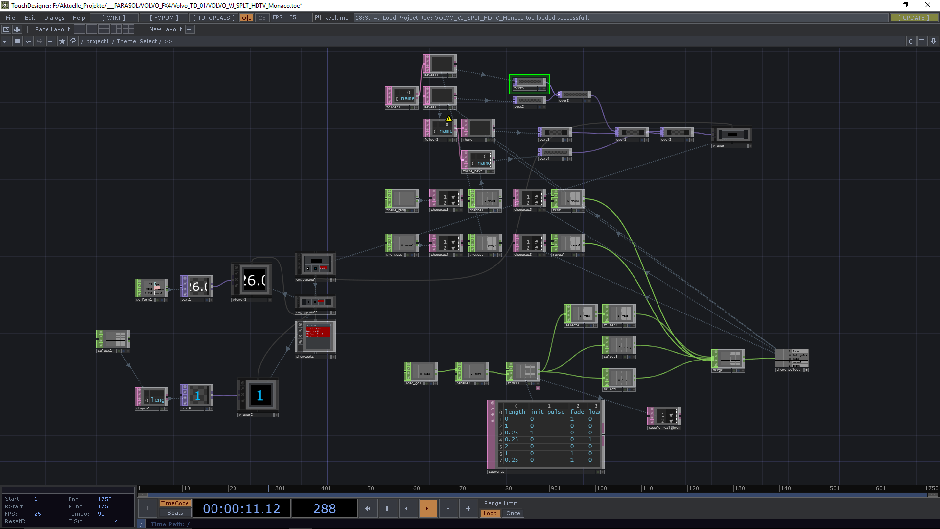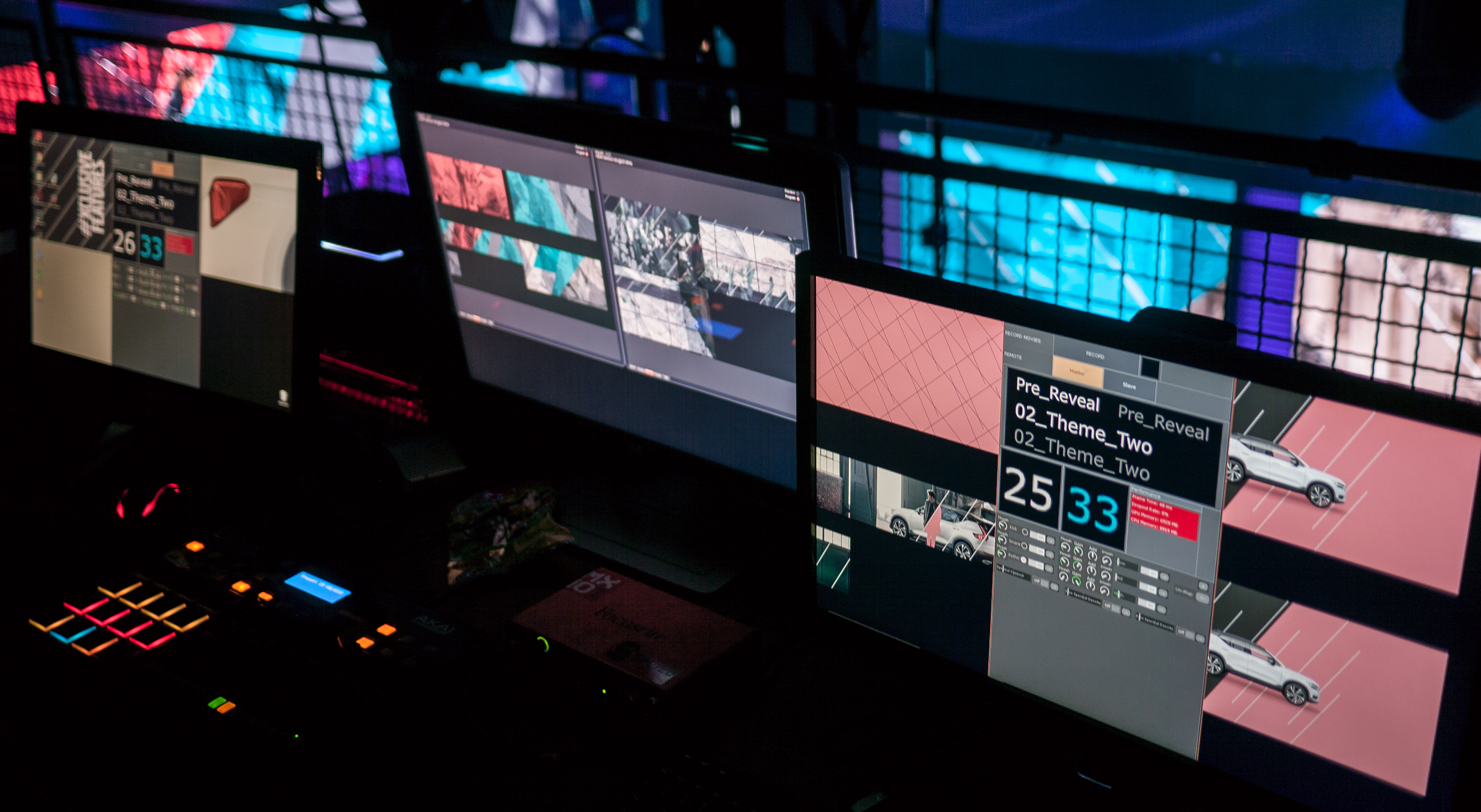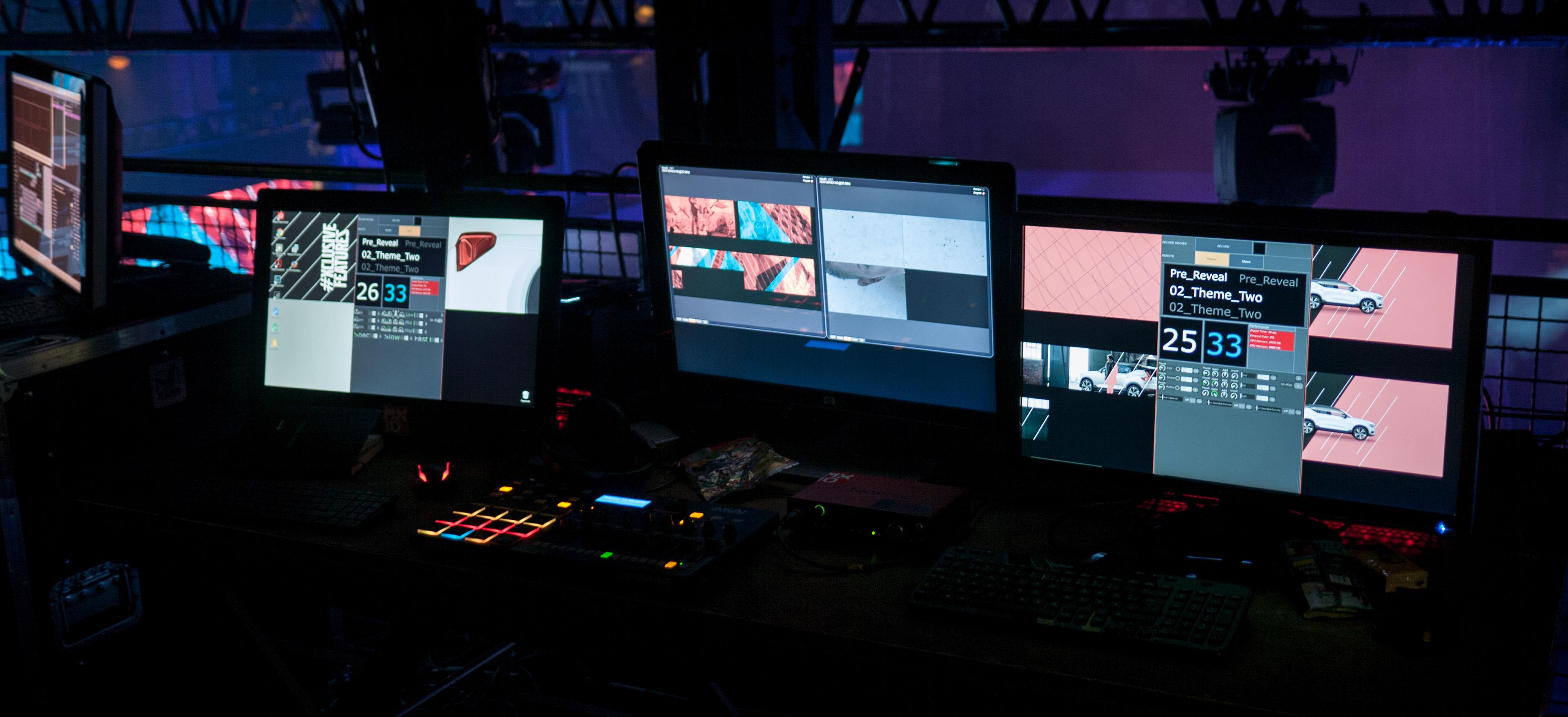 In autumn 2017 I was commissioned by Parasol Island, a high profile content production company to take their visuals for the reveal of the new Volvo XC40 into the live environment of the XCITE Night roadshow, which toured through 7 major German cities. The content had to be remixed live, in sync with the band and was spread out over 7 outputs with diverse resolutions. I designed a VJ engine in TouchDesigner, the visual programming environment, that could be fed by the Parasol Island team through folders with still images and mask animations. Those were animated in realtime on two MSI-GS30 laptops (with GTX1080Ti in the docking station), synced over network, controlled with the Akai MPD232 midi controller, composited into two 4k signals and sent over fibre channel to the PRG video crew, that cutted up the signals and routed them to the different outputs.